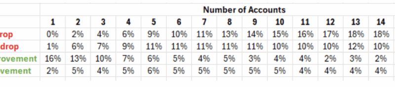 Impact on Plan Results: Plans with many accounts might see a drop in the chance of success, while the impact for plans with fewer accounts is minimal.